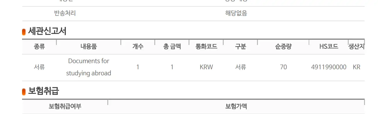 비대면 접수를 하면 배송지 정보 외에도 세관신고서를 작성해야 하는데요, 처음 봤을 때는 뭘 입력해야 하는지 몰라서 당황스러웠는데 지금은 겪고 다 아니까 적습니다. 내용물은 ‘documents for studying aboard’, 금액은 입력 최소값인 1, 순중량은 a4 장수 * 10g으로 했습니다. 무게는 접수할 때 다시 측정하니까 비슷하게만 입력하면 됩니다.