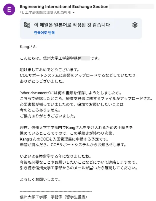 신슈대학 측에서 수취했고 받은 서류를 바탕으로 입학 심사를 한다고 메일을 받았습니다. 지금까지 메일로 보낸 건 뭔가 싶으면서도 일본이라 그런가 원본, 종이(오프라인) 참 좋아하는구나 싶습니다. 그리고 동시에 일본으로의 유학 재류자격을 취득하기 위한 과정을 시작합니다.