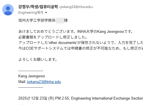수정까지 완료해서 최종적으로 입학서류는 15일에 제출되었습니다. 서로 메일을 보내고 확인하고 준비하고 회신하기까지는 하루는 족히 걸려서 한 번 소통하면 이틀은 지나버립니다. 11일에 처음 제출했어도 주말을 끼다 보니 15일에 최종 제출되었습니다.