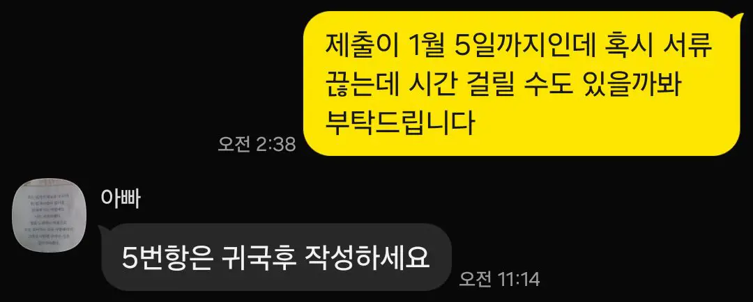메일을 일본 여행 중에 확인을 했고 아버지께 2, 3, 4번을 끊어달라고 부탁을 드렸습니다. 준비해주신다면 저는 5번만 준비하면 되겠네요. 다시 한 번 체재비를 부담해주시는 그리고 다녀오실 수 있도록 도와주시는 부모님께 감사드립시다.