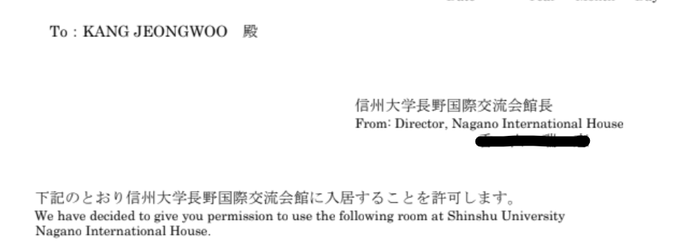 다시 돌아와서, 21일까지 기숙사(信州大学長野国際交流会館, 신슈대학나가노국제교류회관) 입거 신청서를 작성해서 제출해달라고 요청받았습니다. 작성할 것을 하나하나 알아볼까요.