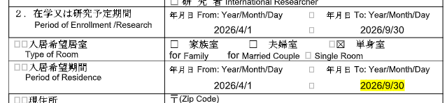 제 교환학생 기간은 4월 1일부터 9월 30일까지이고 기숙사 거주 기간도 4월 1일부터입니다. 9월 30일이 최대이기 때문에 저렇게 입력되어 있지만 줄일수도 있습니다. 딱 맞춰야 하는 것도 아니고 나중에 다시 알려줘도 되기 때문에 저는 그냥 9월 30일로 두었습니다. 그렇게 해도 문제는 없다네요.