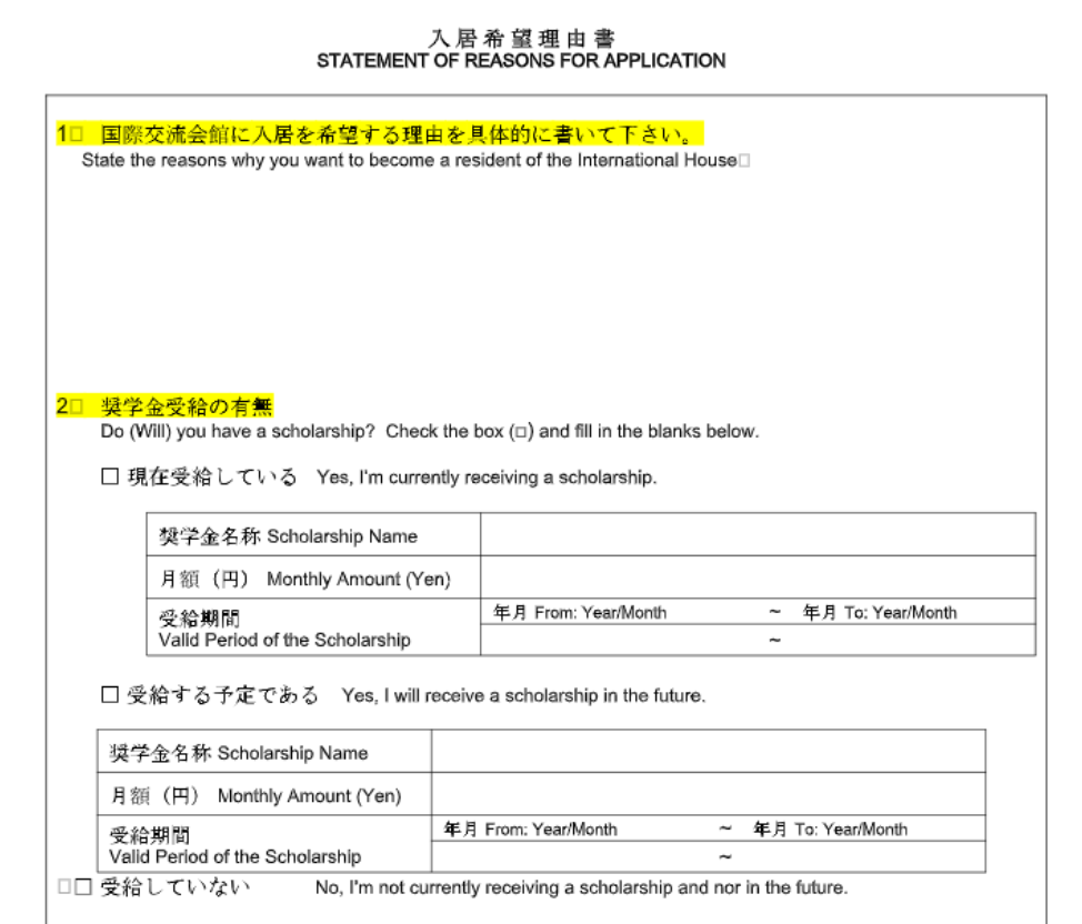 둘째는 뭣좀 적어야 하는 건데 ‘왜 기숙사에 들어오려는지’ 그리고 ‘받고 있는 장학금이 있는가’입니다. 저는 받고 있는 장학금은 없기에 ‘受給していない’(수급하고 있지 않음)에 체크했고, 왜 입사하고 싶은지는.. 그냥 다른 유학 온 외국 학생들과도 교류하며 잘 지내겠다~식의 지독히 상투적인 말을 적었습니다. 크게 중요한 건 아닐테니까요 뭐.. 제가 입력해야할 노랗게 칠해진 부분은 이게 다입니다. 그럼 끝? 이라고 생각될 수도 있지만