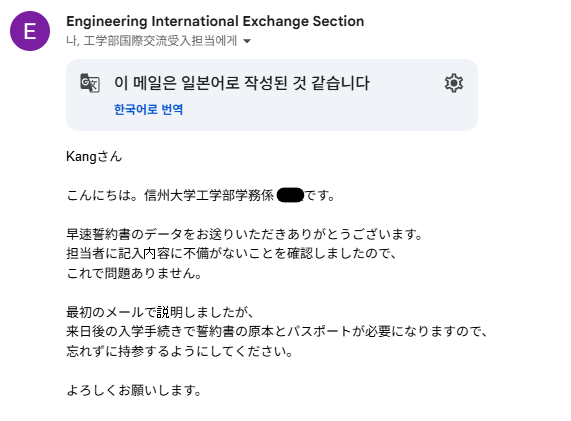그러나 여권사본은 신슈대학에 도착했을 때 제출하면 되고, 건강진단서는 이미 원본도 보내서 제출할 필요가 없습니다. 즉슨 서약서만 보내면 되고 이번에는 따로 제출기간이 없습니다. 왜냐하면 서약서에 일본 체류 시의 주소를 적어야 하는데 저는 서약서 작성 요청을 16일에 받았고 이때는 아직 기숙사 배정이 되지 않아 일본 체류 주소(기숙사 방 호수까지 기입해야 함)를 기입할 수 없었기 때문입니다.