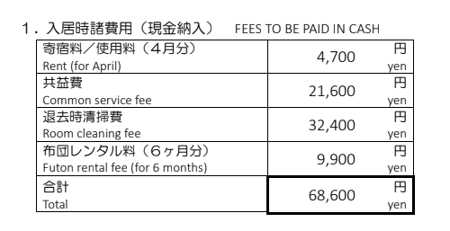 - 기숙료 매월 4,700엔 (4,700 x 5개월 = 23,500엔)