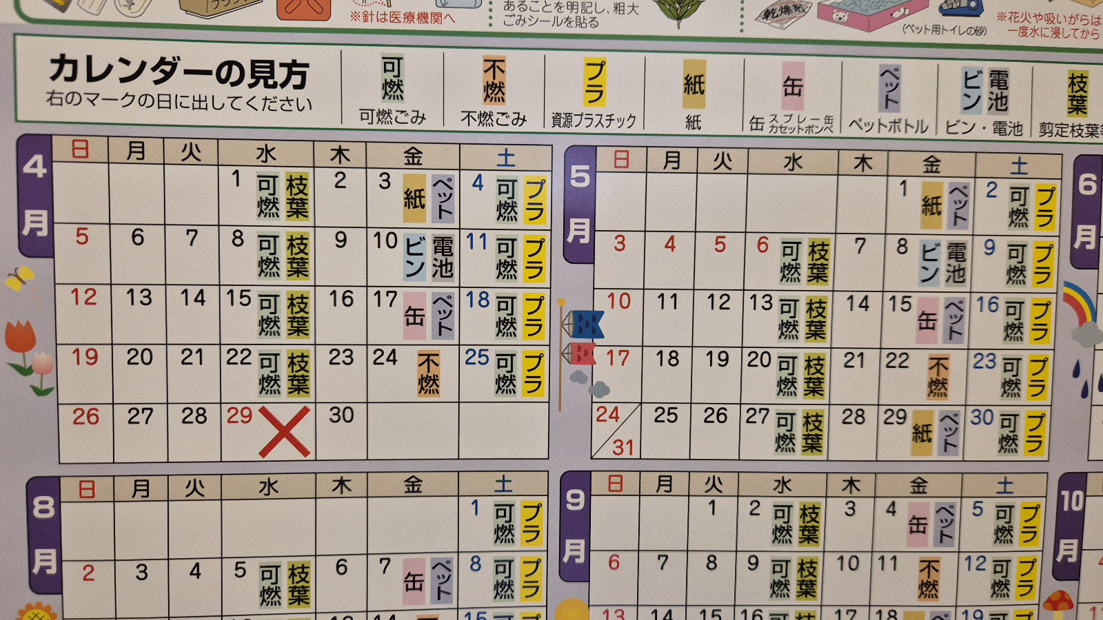 쓰레기는 한국과 달리 크게 가연(可燃), 불연(不燃), 플라스틱, 종이, 페트, 가전제품, 전지(電池)로 구분합니다. 상세히 적어보고 싶어도 방식이 지자체마다도 다를테고 여기에 전부 적기도 어려우니 생략할게요.